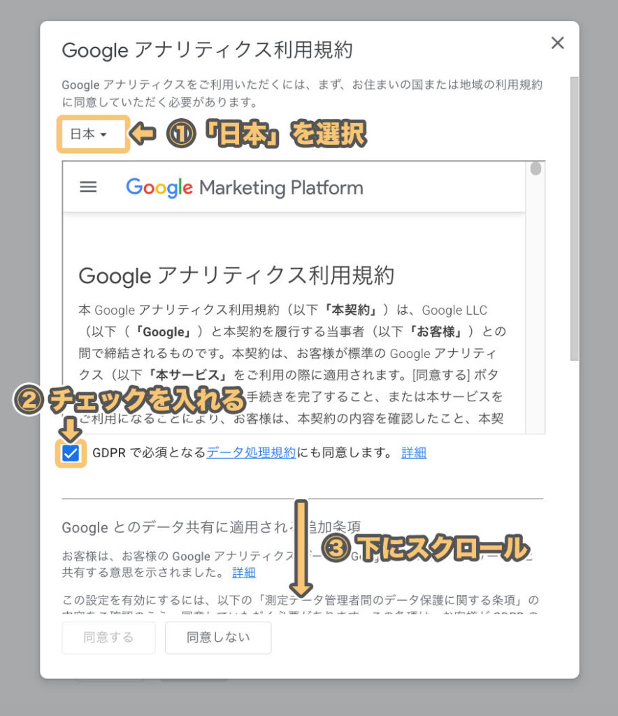 - 「Google Marketing Platform」に同意するため、チェックを入れる