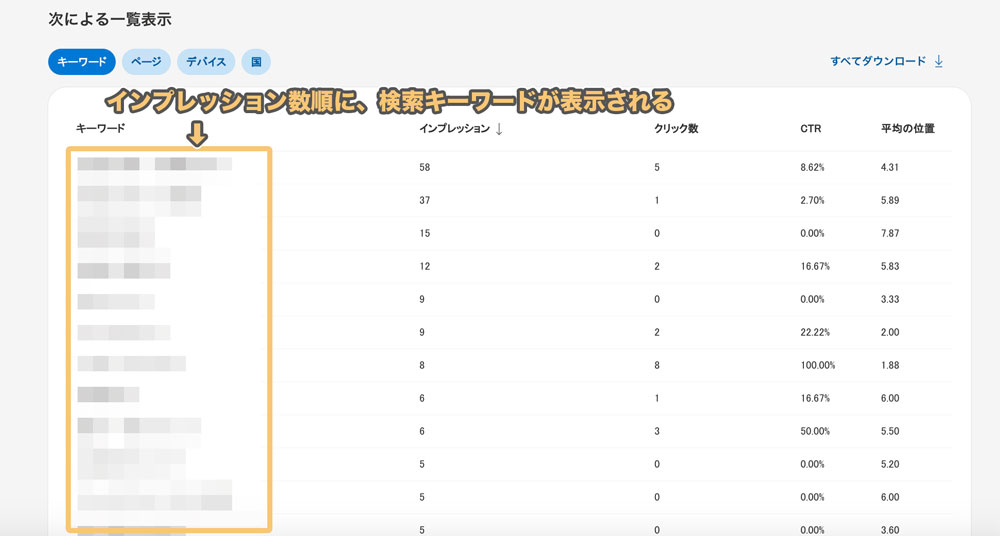 上記のように、インプレッション順に、サイト全体のキーワードが表示されます