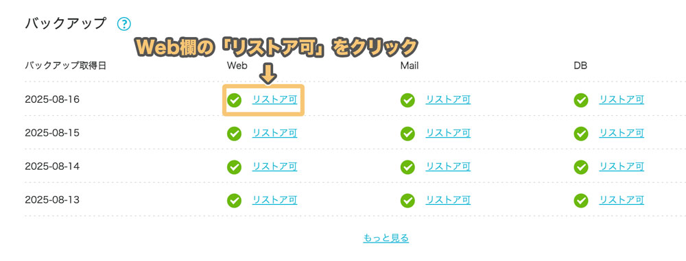 この中の最新の日付の「Web」と「DB」のデータを利用することで、サイトを最新の日付の時の状態に復元することができるのです