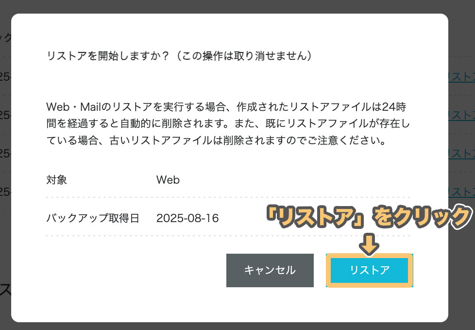というポップアップが出るので、バックアップしたいサイトのDBを選択し、「リストア」をクリックします