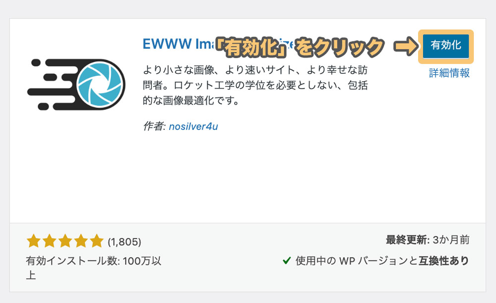 有効化ボタンを押して、「EWWW Image Optimizer」を有効化しましょう
