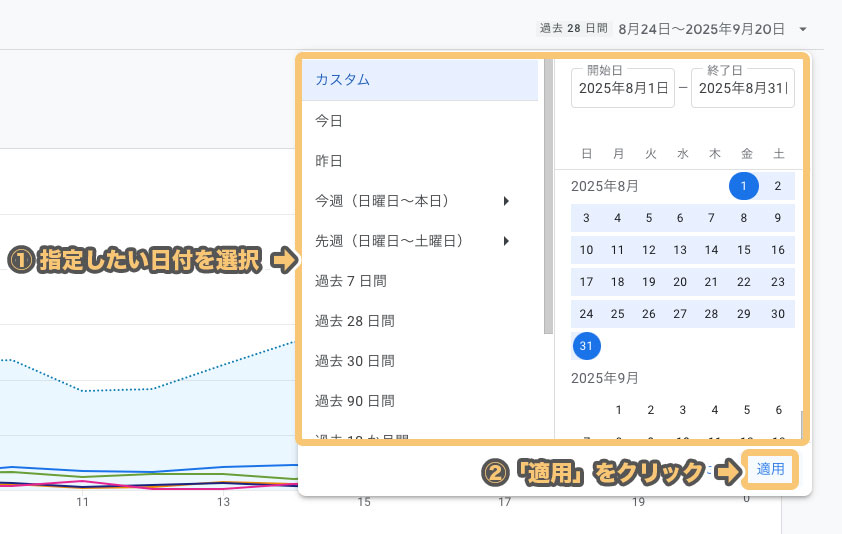 指定したい期間を選択し、適用(Apply)することで変更可能です