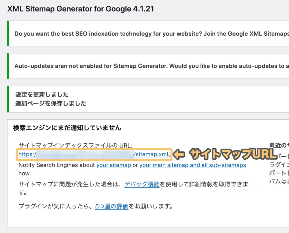 ちなみにサイトマップURLはWordPressの「XML Sitemaps」設定画面の上部の