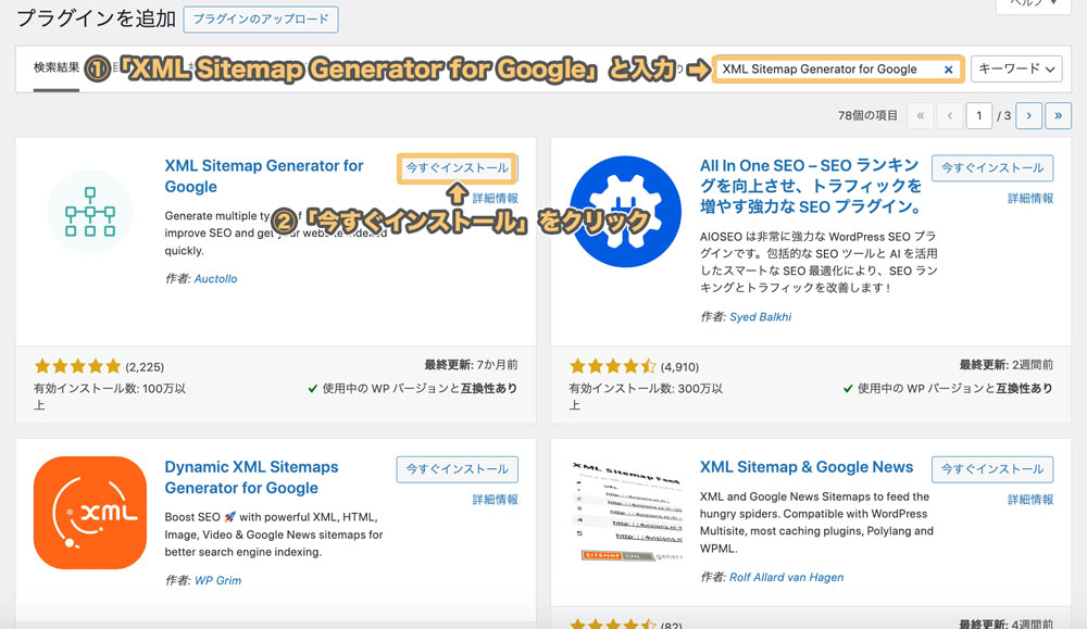 右上の検索窓に、「XML Sitemap Generator for Google」と入力するとプラグインが見つかるので、「今すぐインストール」をクリックします