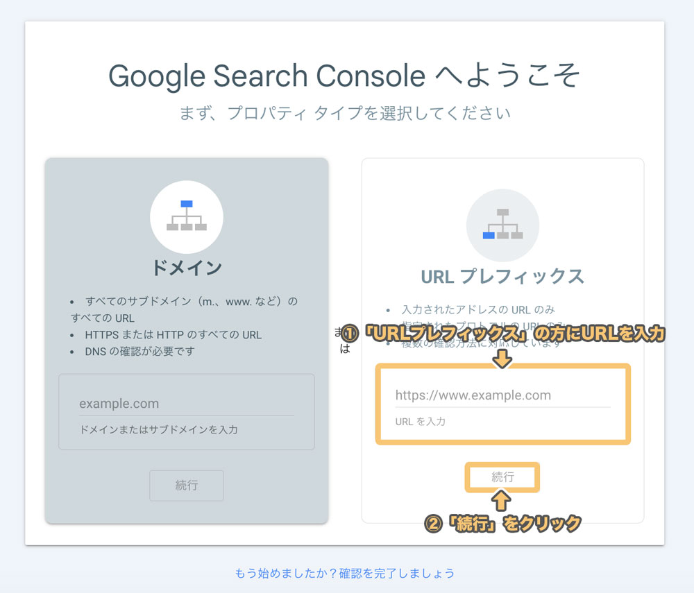 右側の「URLプレフィックス」の方に、URLを入力し、「続行」をクリックします